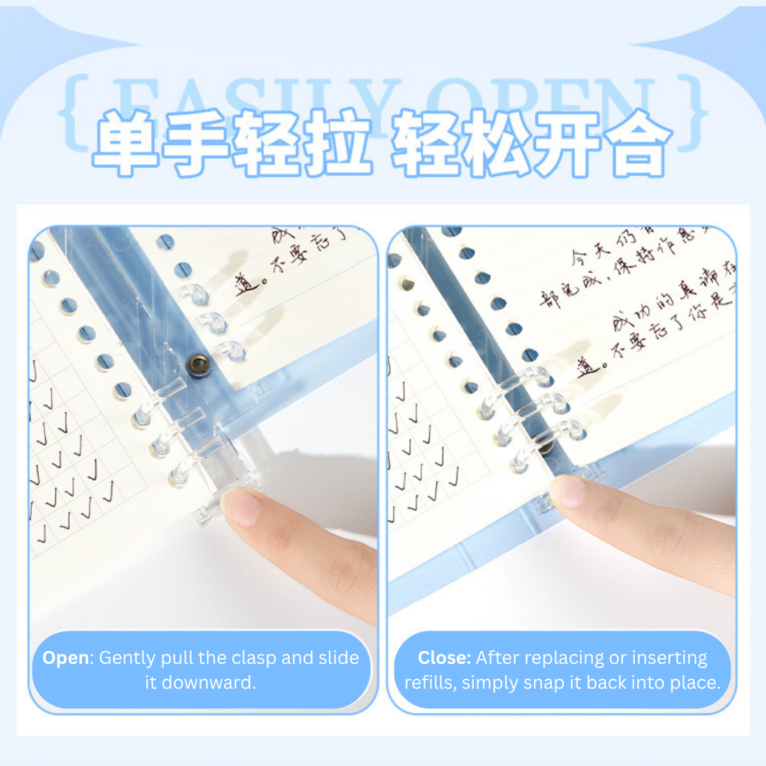 Features a smooth, hand-friendly design with a split-ring mechanism for easy writing across pages—no bumps, no discomfort. The notebook opens effortlessly with a simple pull and allows you to replace inserts freely without noise or jams.