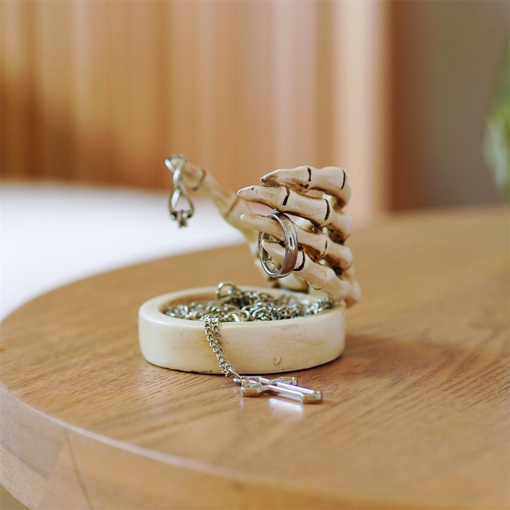 Skeleton Hand Candle Holder - Crafted from durable resin, this detailed piece features a skeletal hand cradling your candle, creating a striking centerpiece for Halloween parties, gothic decor, or year-round style. Its shallow base also works perfectly as a jewelry tray or trinket dish when not in use.