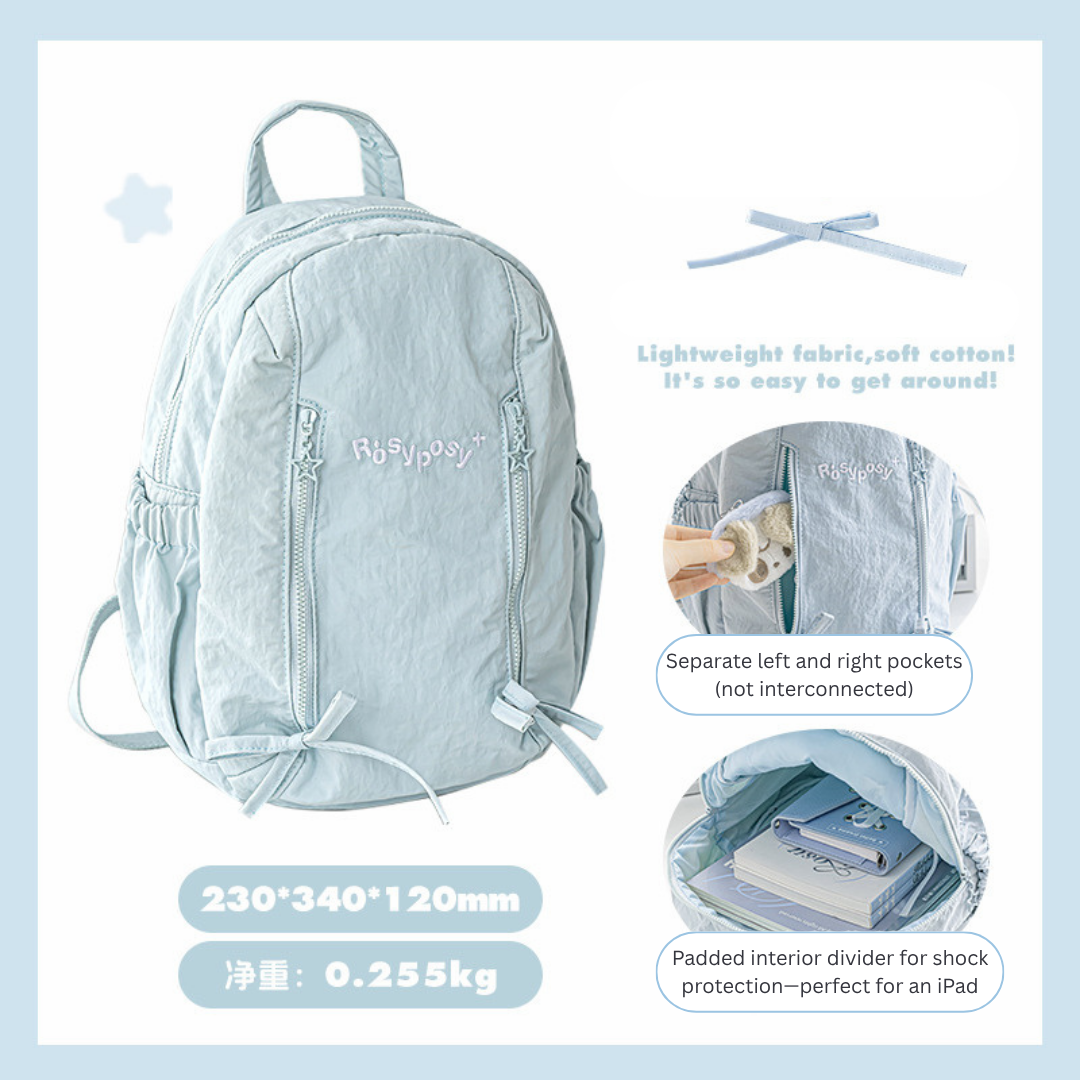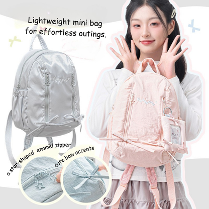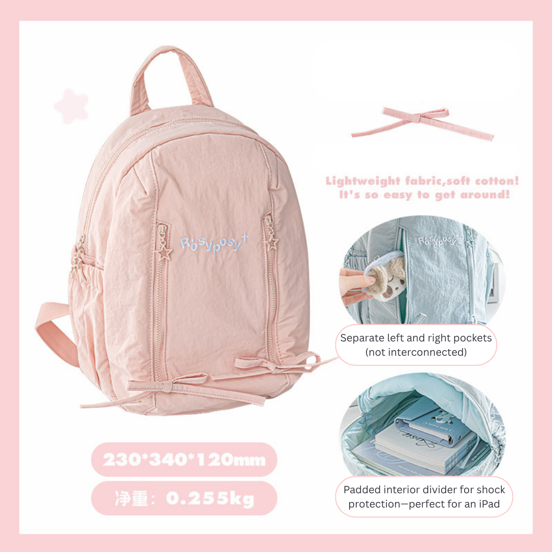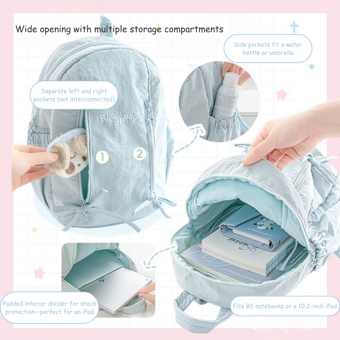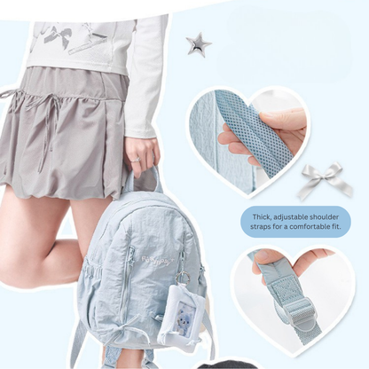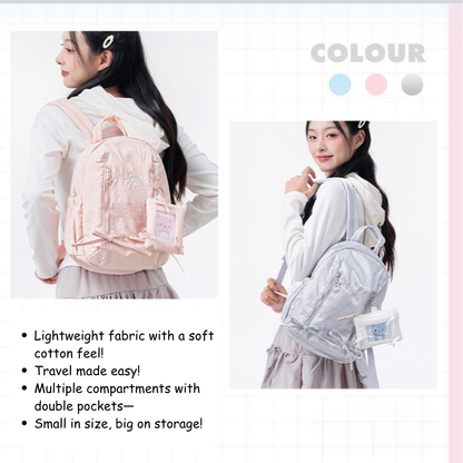 Designed with both style and function in mind, this compact yet spacious backpack measures 230×340×120mm and fits B5 notebooks and up to a 10.2-inch iPad with ease. Made from lightweight nylon fabric, it offers a soft cotton-like texture that’s gentle to the touch and effortless to carry.