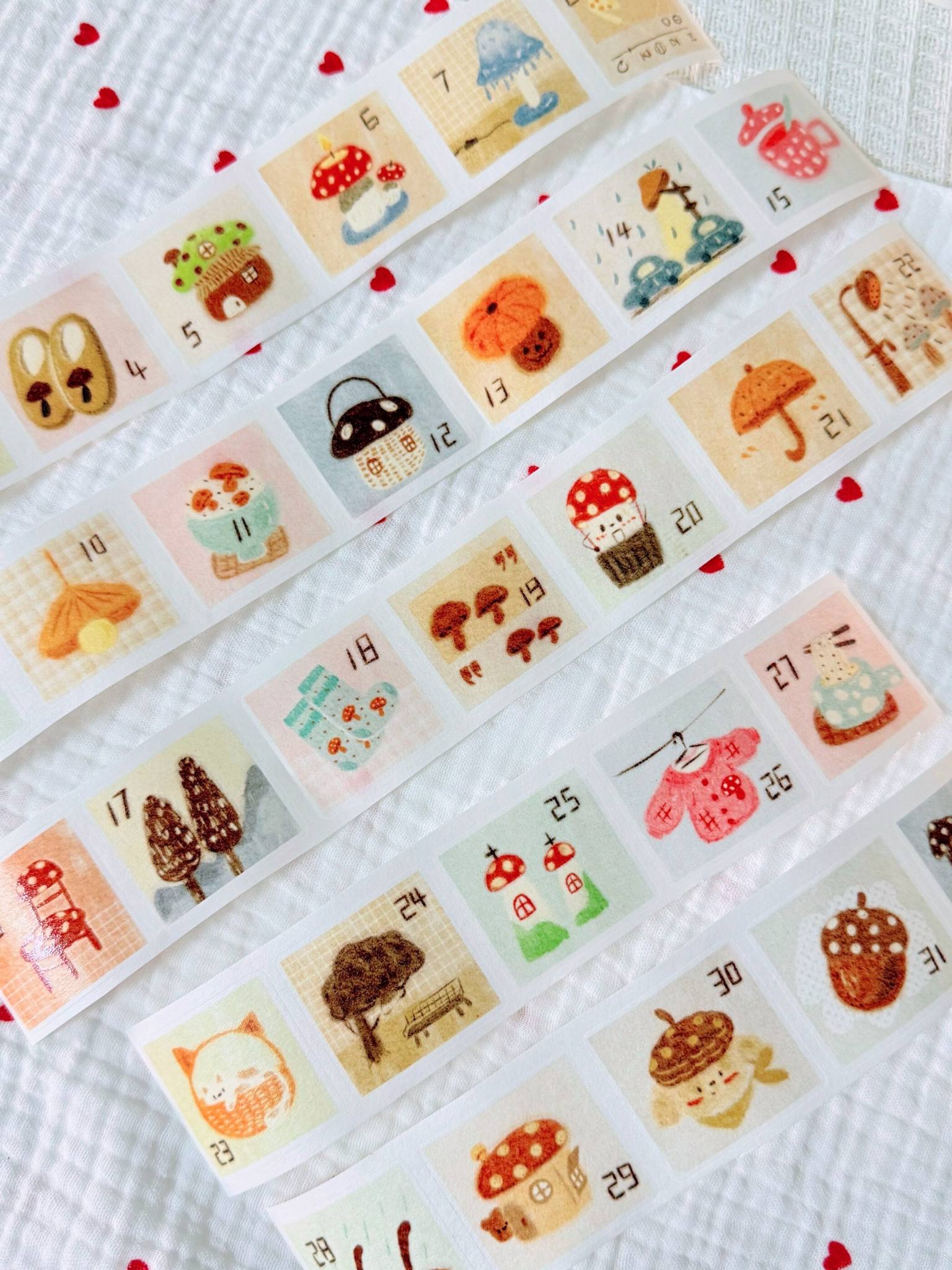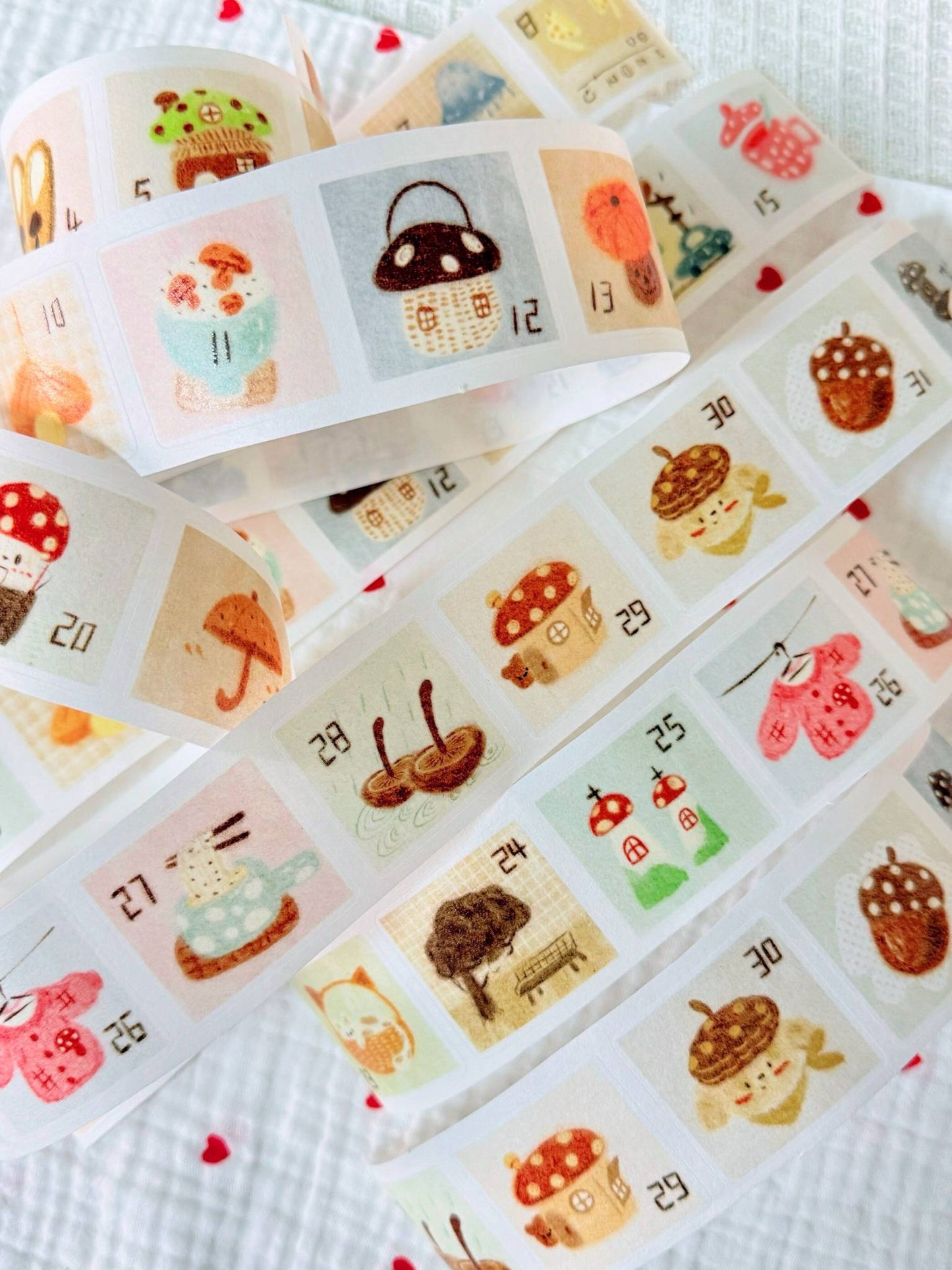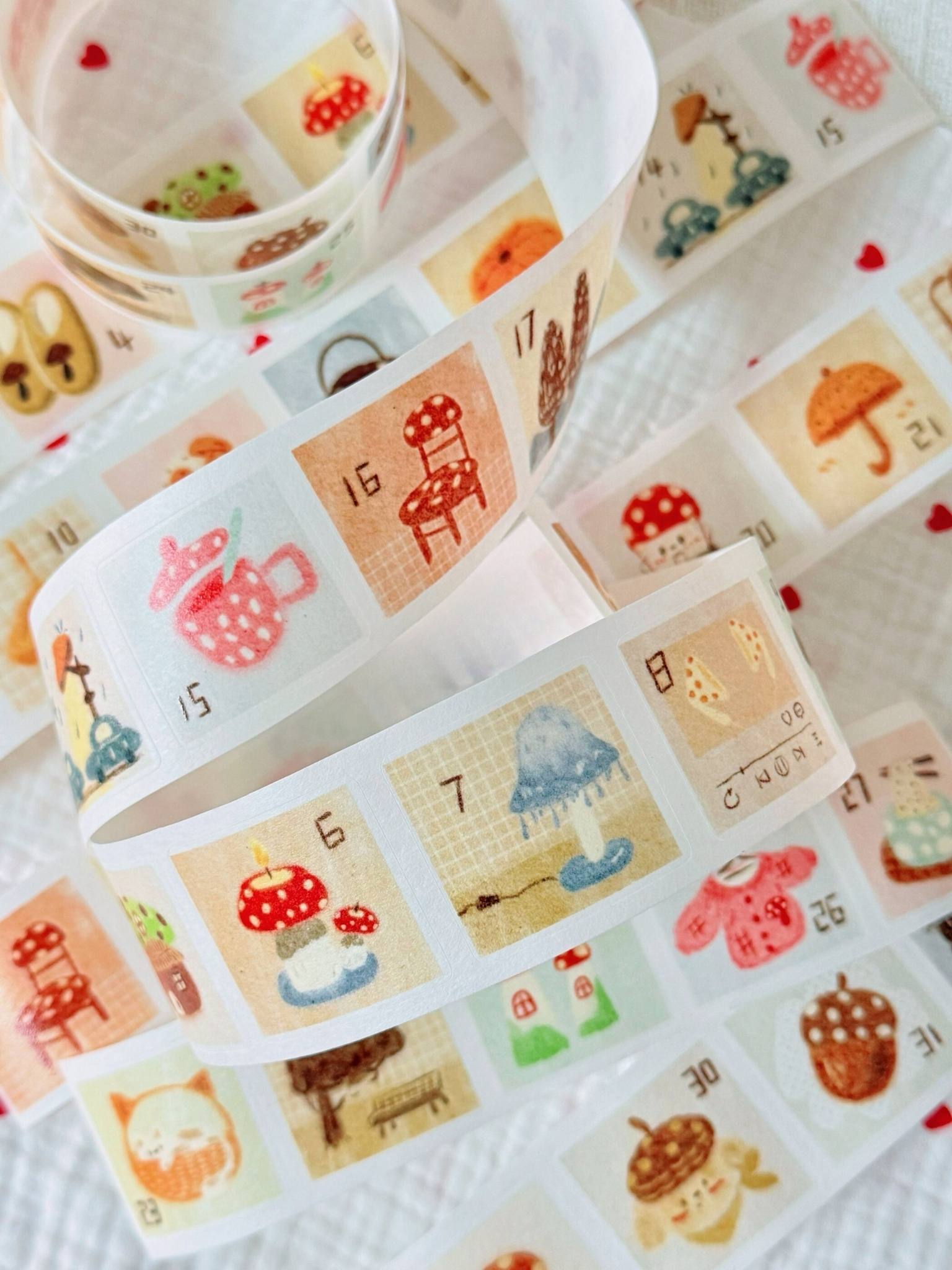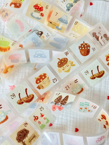 This soothing washi and PET sticker tape features adorable mushroom motifs paired with date markers, perfect for adding warmth and personality to your daily journal, planner, or scrapbook.