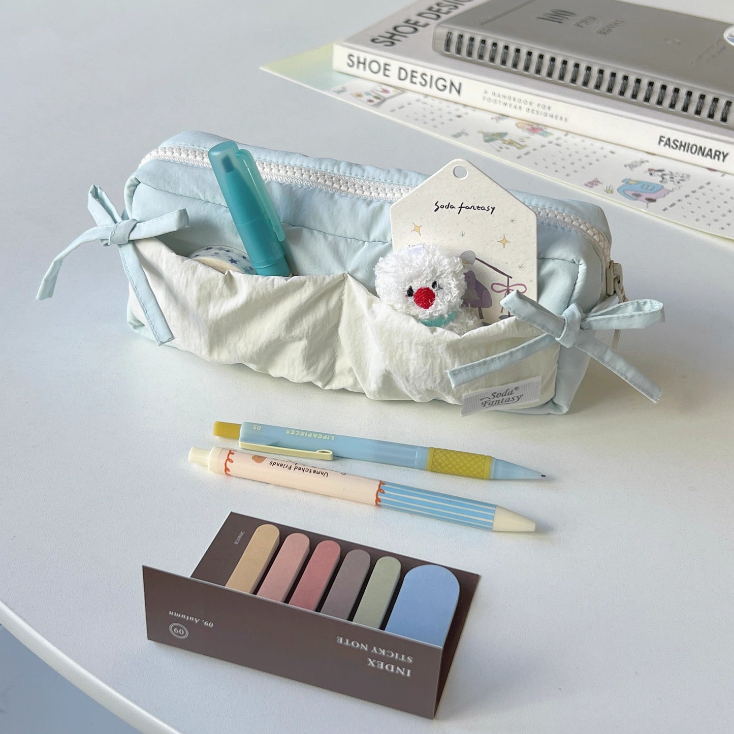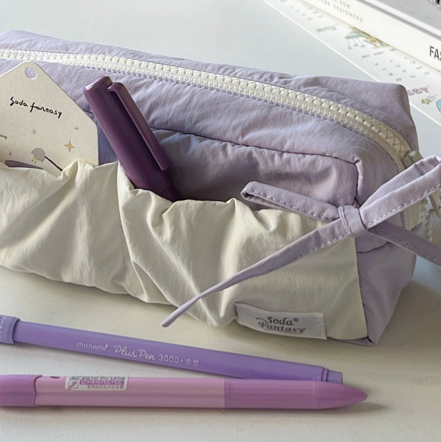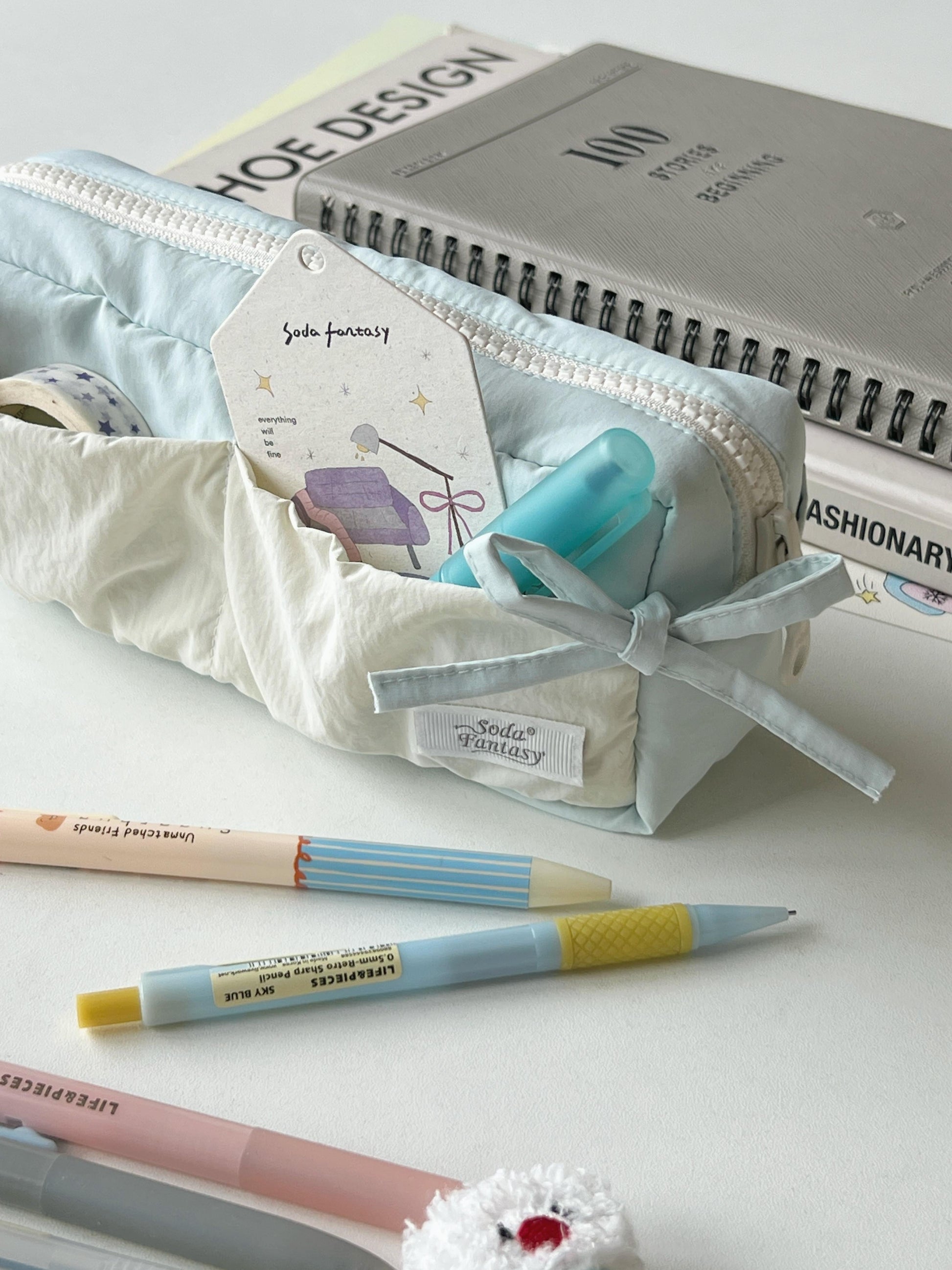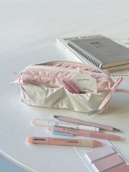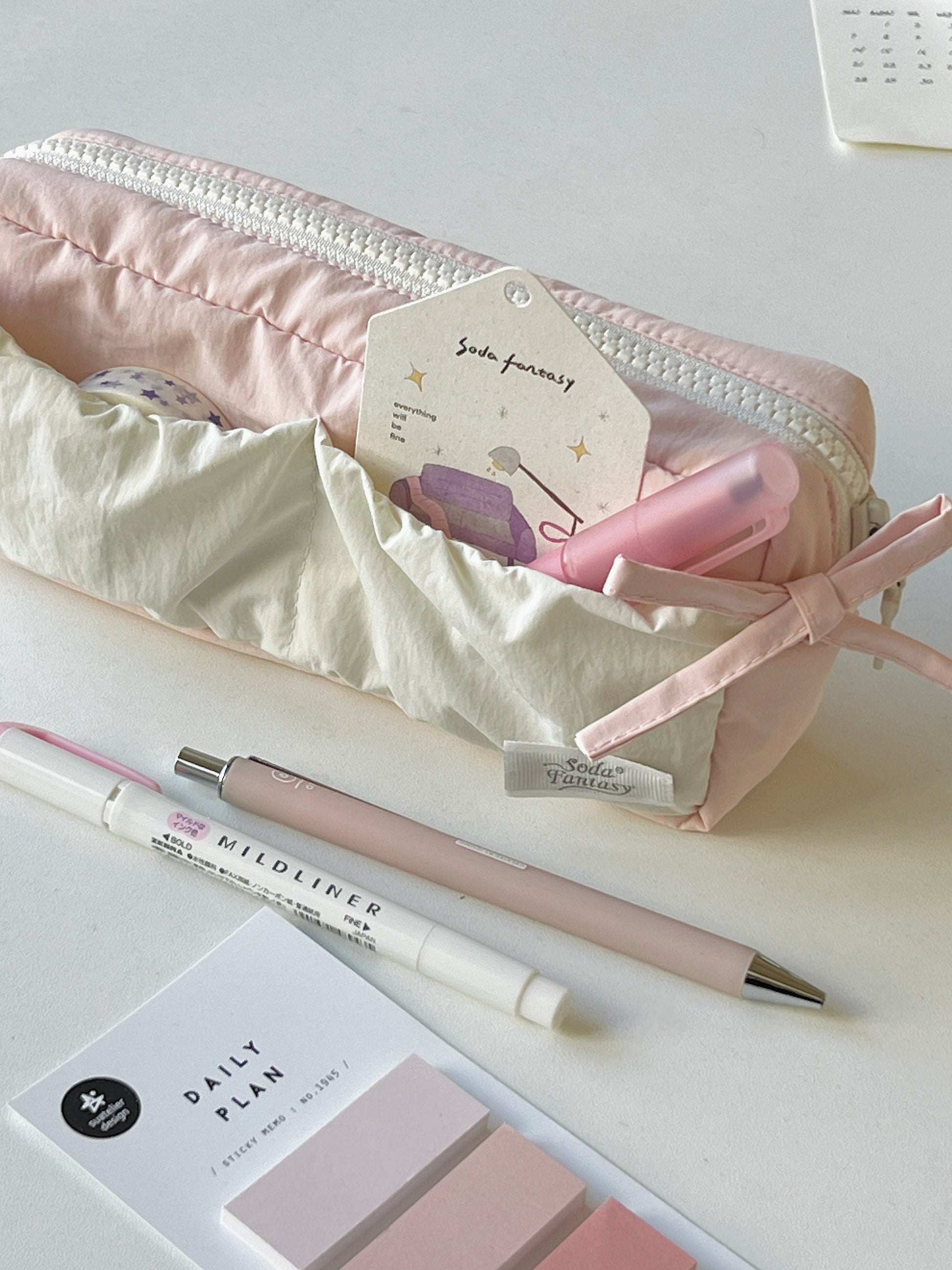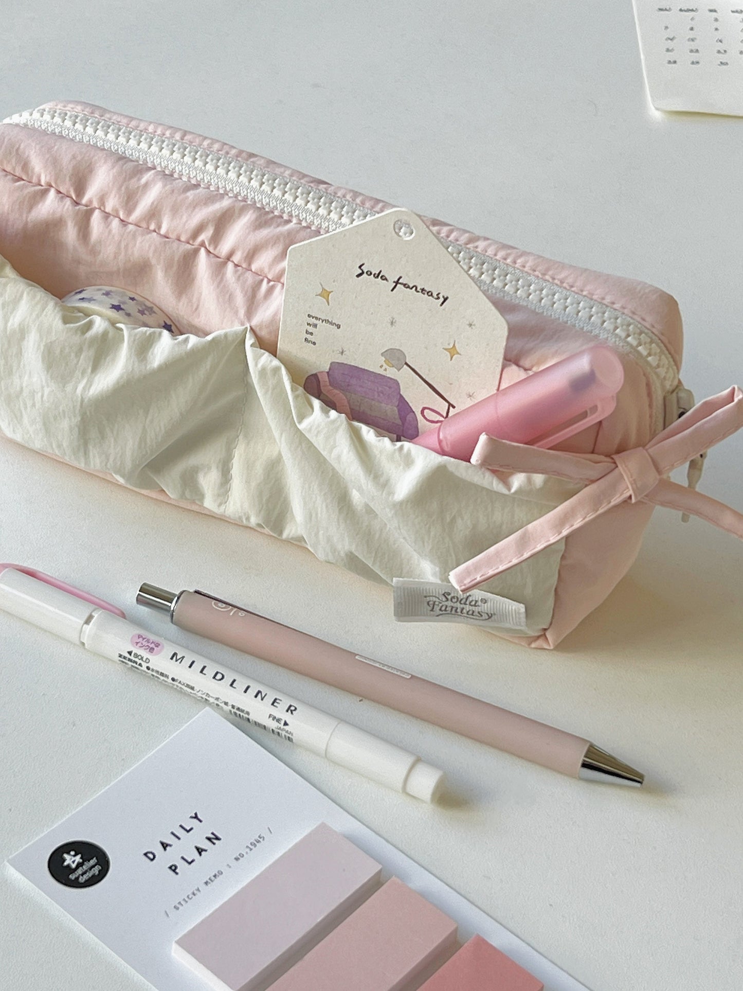 Crafted from durable water-resistant nylon, this charming pencil case features an adorable cloud-loaf shape adorned with a signature bow for that extra touch of personality. With its structured build and roomy interior, it comfortably fits around 40 pens β making it the perfect companion for students, journal lovers, and anyone who needs a little whimsy in their workspace.