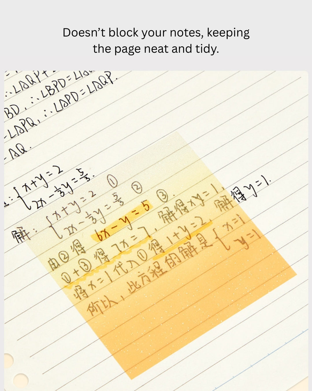 - Clear & Transparent: See your original text underneath—perfect for textbooks, planners, and journals
